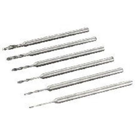 6 forêts HSS hélicoidaux. Diamètres : 0,3 / 0,5 / 0,8 / 1,0 / 1,2 / 1,5 / 1,8 / 2,5 / 3,0 mm.