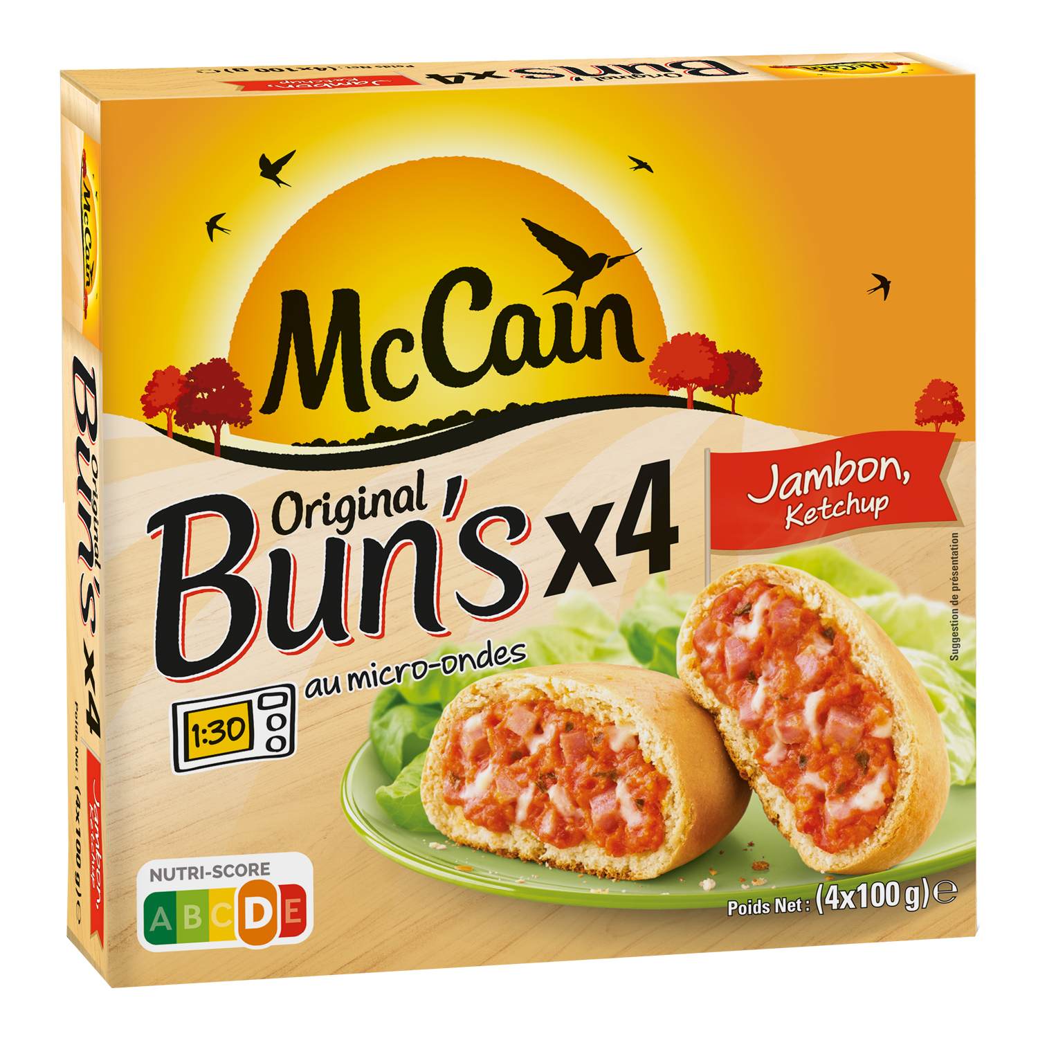 Une recette familiale composée de Jambon, Fromage, de tomates et de Ketchup. La recette préférée des enfants ! Original Bun's : Les petits pains ronds, dorés et gourmands garnis de recettes généreuses ! À table avec une salade, en buffet entre amis ou simplement sur le pouce, ils vous permettront de faire à tout moment un repas délicieux et original. Et pour varier les plaisirs, variez les recettes !