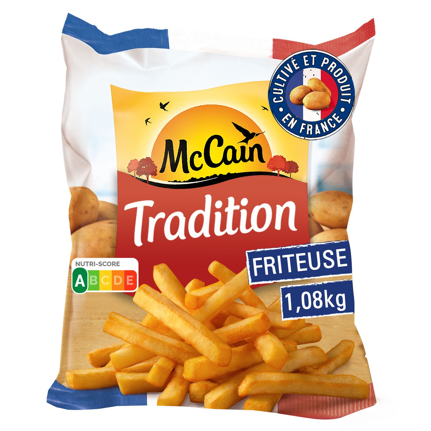 Des frites larges produites en France à partir de pommes de terre Françaises, Préparées sans huile de palme et sans conversateur. Produit végétarien