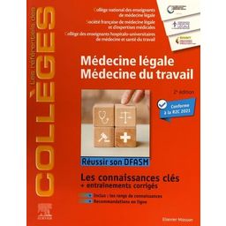 En parfaite conformité avec le programme de DFASM (diplôme de formation approfondie en sciences médicales) s'inscrivant dans la R2C 2021 cet ouvrage rassemble l'ensemble des connaissances fondamentales en matière de Médecine légale et de Médecine du travail. Cette 2e édition encore plus didactique propose une mise à jour complète de l'ensemble des données s'enrichit de nouveaux items d'illustrations inédites et propose une série d'entraînements révisés et augmentés. Fidèle à l'esprit de la précédente édition cet ouvrage est composé de deux grandes parties : une partie Connaissances qui aborde tous les items relevant de ces deux disciplines en présentant les items de Médecine légale puis les items de Médecine du travail. Chaque chapitre commence systématiquement par un tableau de hiérarchisation des connaissances en rangs A et B et les situations de départ puis développe la thématique avec l'indication des rangs au fil du texte à l'aide de balises et de couleurs (les notions de rang C sont abordées) étayée de points clés tableaux et figures , une partie Entraînement comportant des QI rattachées aux chapitres pour contrôler ses connaissances et des dossiers progressifs courts véritable outil d'autoévaluation pour se préparer aux épreuves. L'ouvrage s'inscrit dans la collection Les référentiels des Collèges dont le format et la maquette en couleurs offrent une clarté de lecture et facilitent la compréhension et la mémorisation.