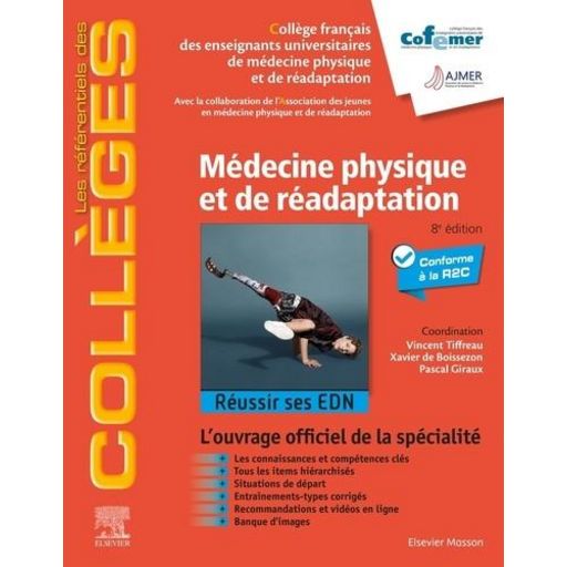 L'ouvrage En parfaite conformité avec le programme de DFASM (diplôme de formation approfondie en sciences médicales) s'inscrivant dans la R2C cet ouvrage rassemble l'ensemble des connaissances indispensables à acquérir en médecine physique et de réadaptation. Il présente dans le détail les items du programme relevant de cette spécialité et comporte deux parties : - une partie Connaissances divisée en 2 sous-parties : la première rassemblant les connaissances de base et la seconde développant tous les items spécifiques de la discipline. Chaque chapitre débute systématiquement par les situations de départ un tableau de hiérarchisation des connaissances en rangs A et B une vignette clinique puis développe la thématique avec l'indication des rangs au fil du texte (les rangs C sont également abordés) étayée de points clés tableaux et figures de rubriques sur les notions à retenir et d'un accès aux textes de recommandations par flashcodes. Le lecteur peut retrouver à la fin des chapitres des QI avec leur rang corrigées portant sur l'item favorisant l'entraînement immédiat , - une partie Entraînements qui propose des cas cliniques et des KFP corrigés et commentés avec indication des rangs offrant un outil performant d'autoévaluation. Cet ouvrage didactique bénéficiant d'une mise à jour complète de l'ensemble des données et détaillant les pratiques et recommandations les plus récentes connaît ici sa 8e édition et constitue une référence de la discipline de MPR. Il propose également de nouvelles illustrations une vignette clinique en ouverture de chapitre ainsi qu'un accès à des vidéos et la reconduction de la banque d'images en ligne. Accédez à la banque d'images de cet ouvrage : l'ensemble des illustrations y sont regroupées et accessibles facilement via un moteur de recherche. Et retrouvez d'autres fonctionnalités. Le public Les étudiants en DFASM qui souhaitent se préparer efficacement aux EDN et valider leur DFASM ainsi que les médecins généralistes et les acteurs des professions de santé confrontés à ce type de patients qui souhaitent mettre à jour leurs connaissances. Les auteurs Cet ouvrage est le fruit du travail collectif des membres du Collège français des enseignants universitaires de médecine physique et de réadaptation (COFEMER) en collaboration avec l'Association des jeunes en médecine physique et de réadaptation (AJMER). Cette 8e édition a été coordonnée par les professeurs Vincent Tiffreau Xavier de Boissezon et Pascal Giraux. Pour une maîtrise optimale des connaissances de la R2C : - Les items à jour de la dernière numérotation en vigueur - Pour chaque item un tableau global de hiérarchisation des connaissances A et B avec code couleurs - Dans chaque chapitre au fil du texte le repérage avec balises et code couleurs des rangs de connaissances A et B et en bonus C pour aller plus loin - Les situations de départ avec leur numéro