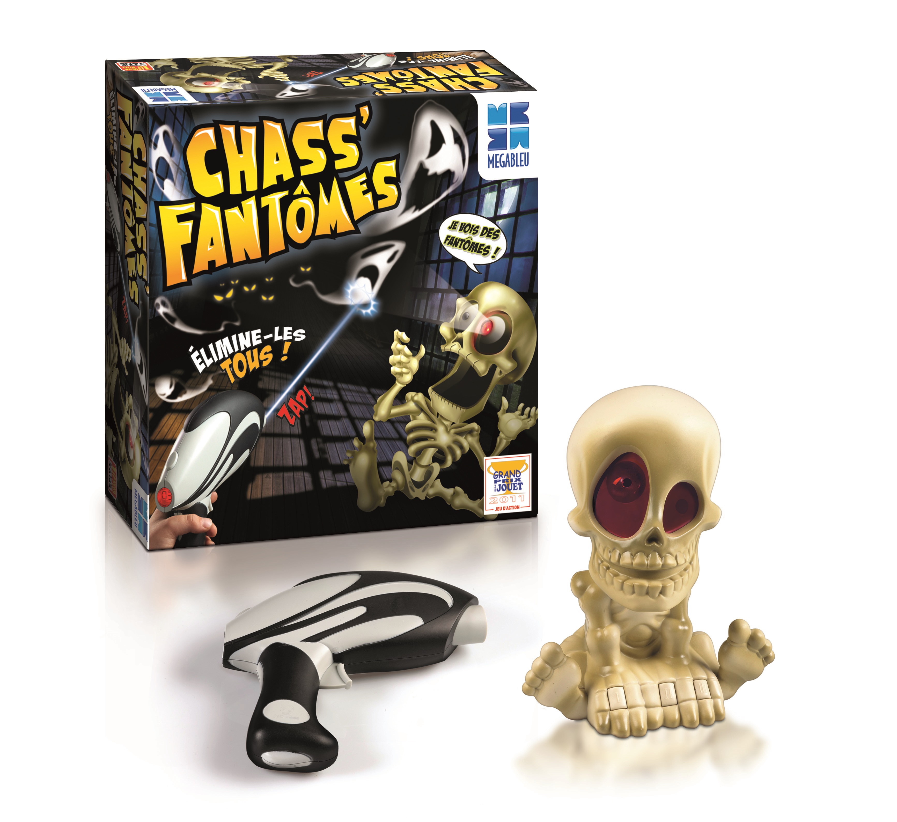 Avec Chass’ Fantômes de Megableu, éteins la lumière et prépare-toi au grand frisson ! Pablo Crâno projette des fantômes sur les murs, en haut, en bas, devant et même derrière grâce à son œil magique ! A toi de bien viser avec le pistolet laser à 6 coups dès qu’un fantôme apparaît ! Pour chaque fantôme éliminé, Pablo Crâno crie et c’est un point de marqué ! 3 vitesses sont disponibles et chaque séance de tirs dure 90 secondes… Qui fera le meilleur score ?