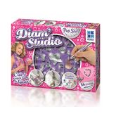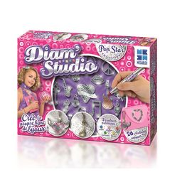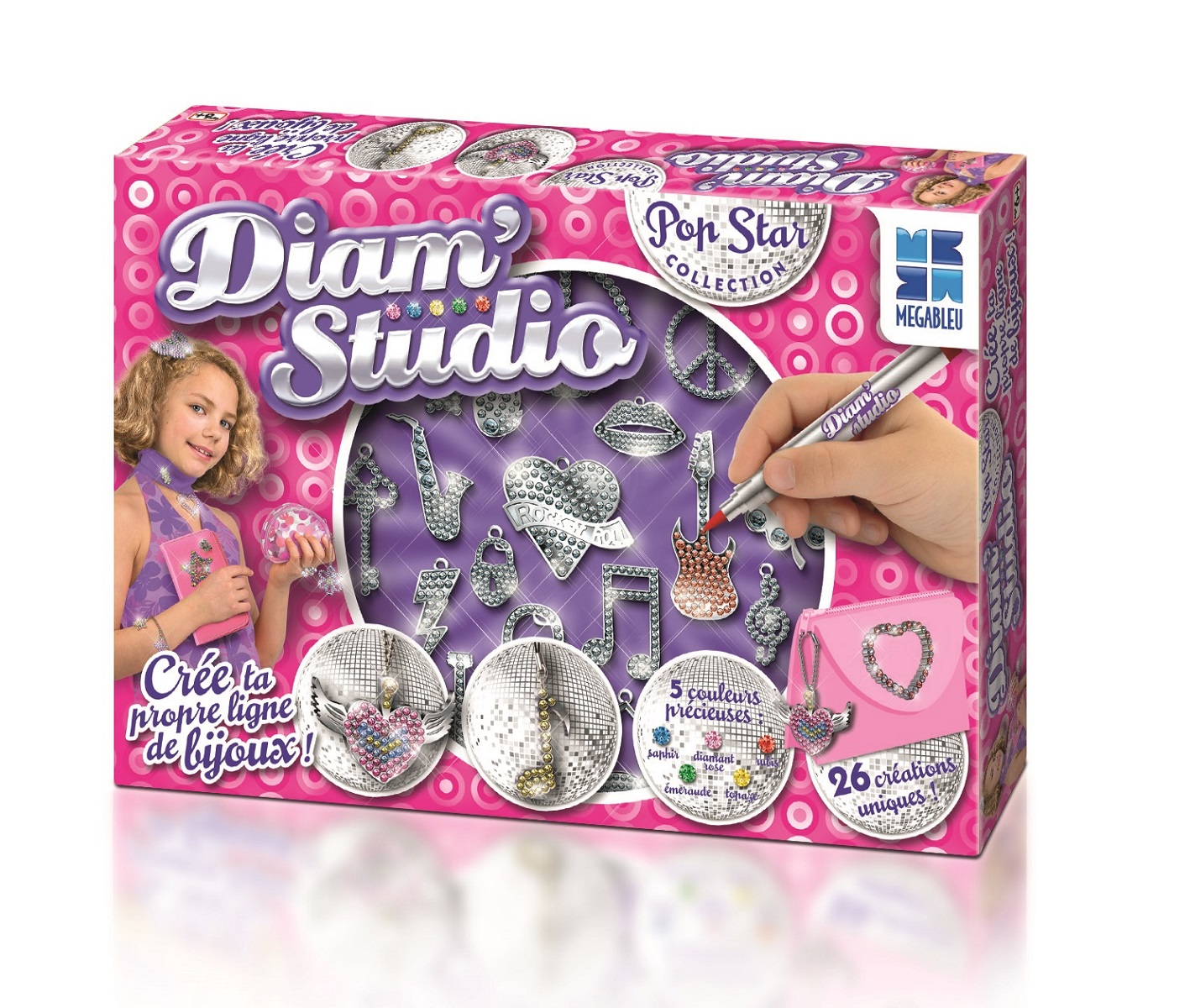 Diam Studio Pop star de Megableu te permet de créer ta propre collection de bijoux sur le thème de la musique, pour être la plus belle et la plus branchée ! Avec les feutres «effet diamant » (saphir, diamant rose, émeraude, rubis, topaze), décore les modèles selon ta créativité. En choisissant parmi