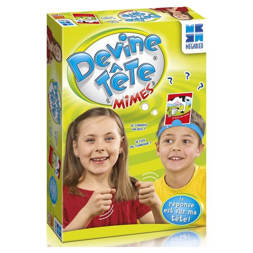 Devine Tête mimes de Megableu, c’est la version « mimes » du grand classique Devine tête !Les joueurs devront à tour de rôle faire deviner à leurs coéquipiers, par des gestes et des sons, l‘action qui est représentée sur la carte qui est sur leur tête : « je bois à la paille », « je reçois un cadeau», « je glisse sur une peau banane »,… Un jeu de mimes désopilant pour petits et grands !