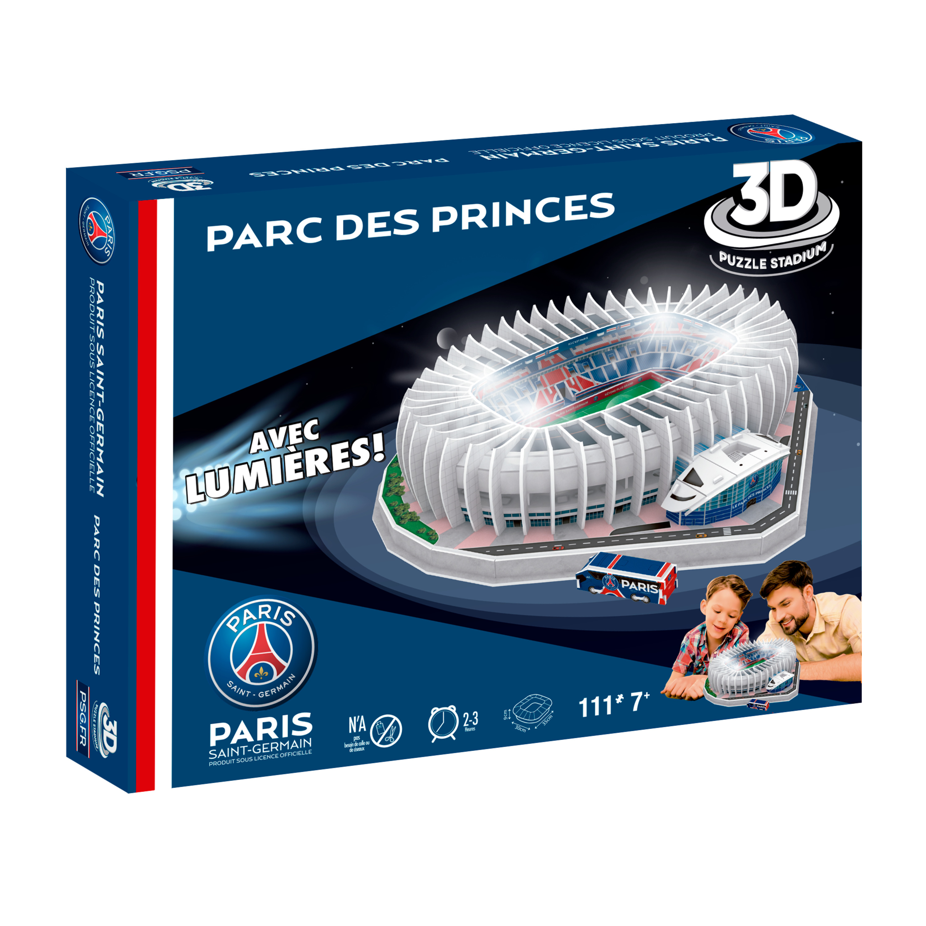 Assemble les pièces de puzzle et construis la réplique du stade de foot du Parc des Princes ! Eclairage d'ambiance par LED intégrées. Montage sans colle, ni outil.