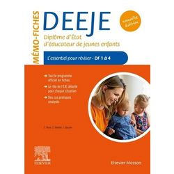 L'éducateur de jeunes enfants (EJE) a pour rôle essentiel de favoriser le développement et l'épa nouissement des enfants de moins de 7 ans. Il exerce dans les établissements d'accueil du jeune enfant mais également dans les établissements qui relèvent du médico-social et de la protection de l'enfance. Le Mémo-fiches DEEJE (diplôme d'Etat d'éducateur de jeunes enfants) propose aux étudiants un outil de révision efficace pour acquérir les connaissances nécessaires à la validation du diplôme. Conforme au référentiel officiel de formation cette nouvelle édition est l'occasion d'actualiser le contenu pour l'ajuster aux réalités et actualités du secteur. Chaque partie correspond à un domaine de formation : DF 1 : Accueil et accompagnement du jeune enfant et de sa famille DF 2 : Action éducative en direction du jeune enfant DF 3 : Travail en équipe pluriprofessionnelle et communication professionnelle socle commun DF 4 : Dynamiques interinstitutionnelles partenariats et réseaux socle commun Focus sur l'initiation à la méthodologie de recherche Lexique anglais / français Conçu sous forme de fiches faciles à consulter l'ouvrage propose une synthèse des connaissances fondamentales : Un cours synthétique avec l'essentiel des notions et techniques à maîtriser. ' Le rôle de l'EJE ' avec les missions du professionnel. Des encadrés ' Situation ' qui témoignent d'un vécu professionnel et en proposent l'analyse.