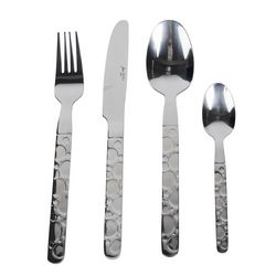 Habillez vos tables de cette magnifique ménagère au design élégant et raffiné. Composée de 24 couverts en inox. Fourchettes, couteaux, cuillère et cuillère à café. Fourchette, couteau, cuillère: épaisseur de l'inox 2,5 mm Cuillère à café: épaisseur de l'inox 1,8 mm. Décor bulles sur le manche