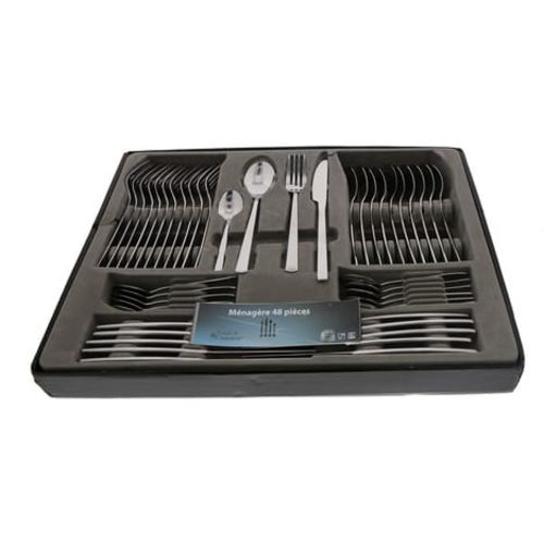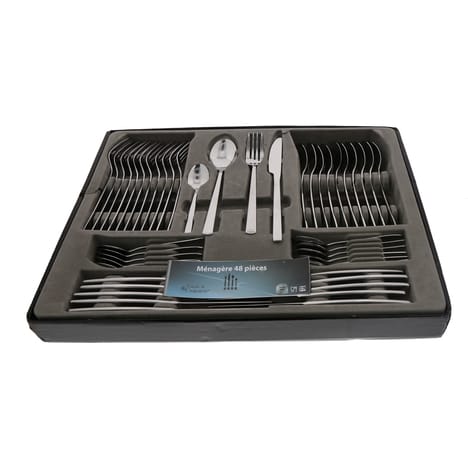 Découvrez cette ménagère de 48 pièces en inox composée de 12 couteaux, 12 fourchettes, 12 cuillères et 12 cuillères à café . Pour les réceptions ou au quotidien, cette ménagère saura trouver sa place sur votre table. Présentée dans un coffret élégant, c'est également une excellente idée cadeau. Cette ménagère est compatible lave-vaisselle.