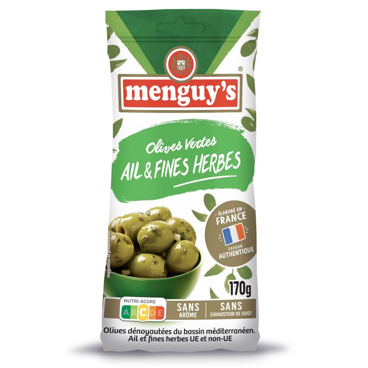 Des olives vertes dénoyautées et rigoureusement sélectionnées, des fines herbes, de l'huile et des véritables morceaux d’ail. Elaboré en France dans notre usine (Frontignan, 34). Sans arôme, sans exhausteur de goût.
