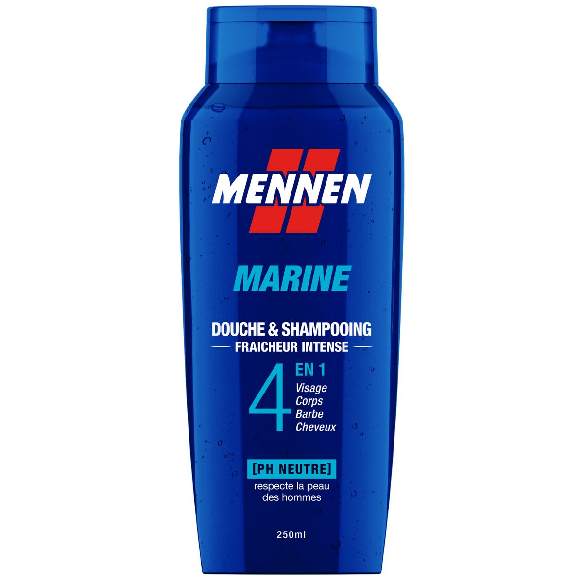 Gel Douche & Shampooing 4 en 1 à la fraîcheur intense et au parfum Marine longue durée. Votre peau, vos cheveux, votre visage et votre barbe sont propres et hydratés.
