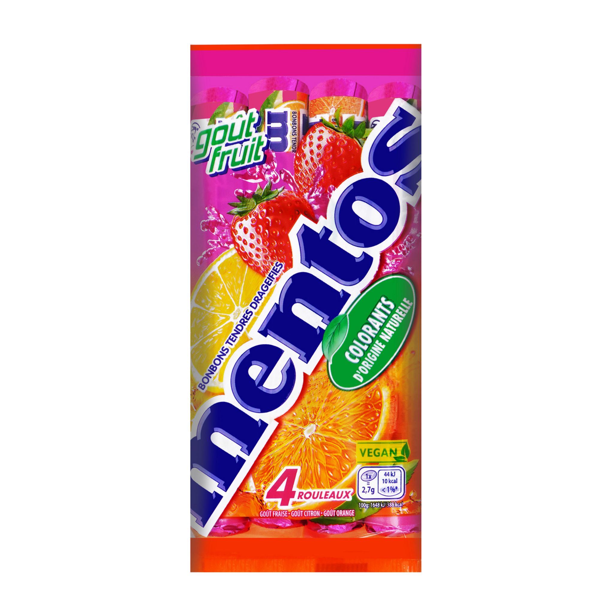 Faites-vous plaisir avec la légendaire dragée ronde Mentos ! Une texture croquante et tendre à la fois déclinée en une multitude de parfums allant de la fraîcheur à la gourmandise. Retrouvez dans un seul rouleau un assortiment de dragées au goût de fruit : fraise, orange et citron à déguster partout.