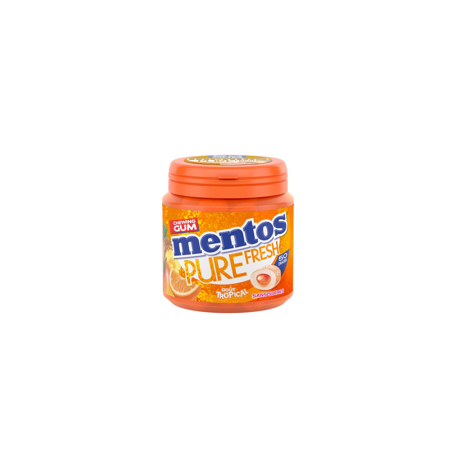 Envie de fraîcheur? Découvrez Mentos Pure Fresh, de délicieuses dragées de chewing-gum sans sucres en bottle au cœur fourré déclinées sur toute une gamme de parfums. Laissez-vous séduire par Mentos Pure Fresh tropical : le mélange subtil des saveurs de l'ananas, de la mangue et de l'orange .