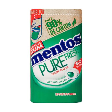 Envie de fraîcheur? Découvrez Mentos Pure Fresh, de délicieuses dragées de chewing-gum sans sucres en boite carton au cœur fourré déclinées sur toute une gamme de parfums. Laissez-vous séduire par Mentos Pure Fresh Chloro : une avalanche de douceur pour une haleine toujours fraîche.