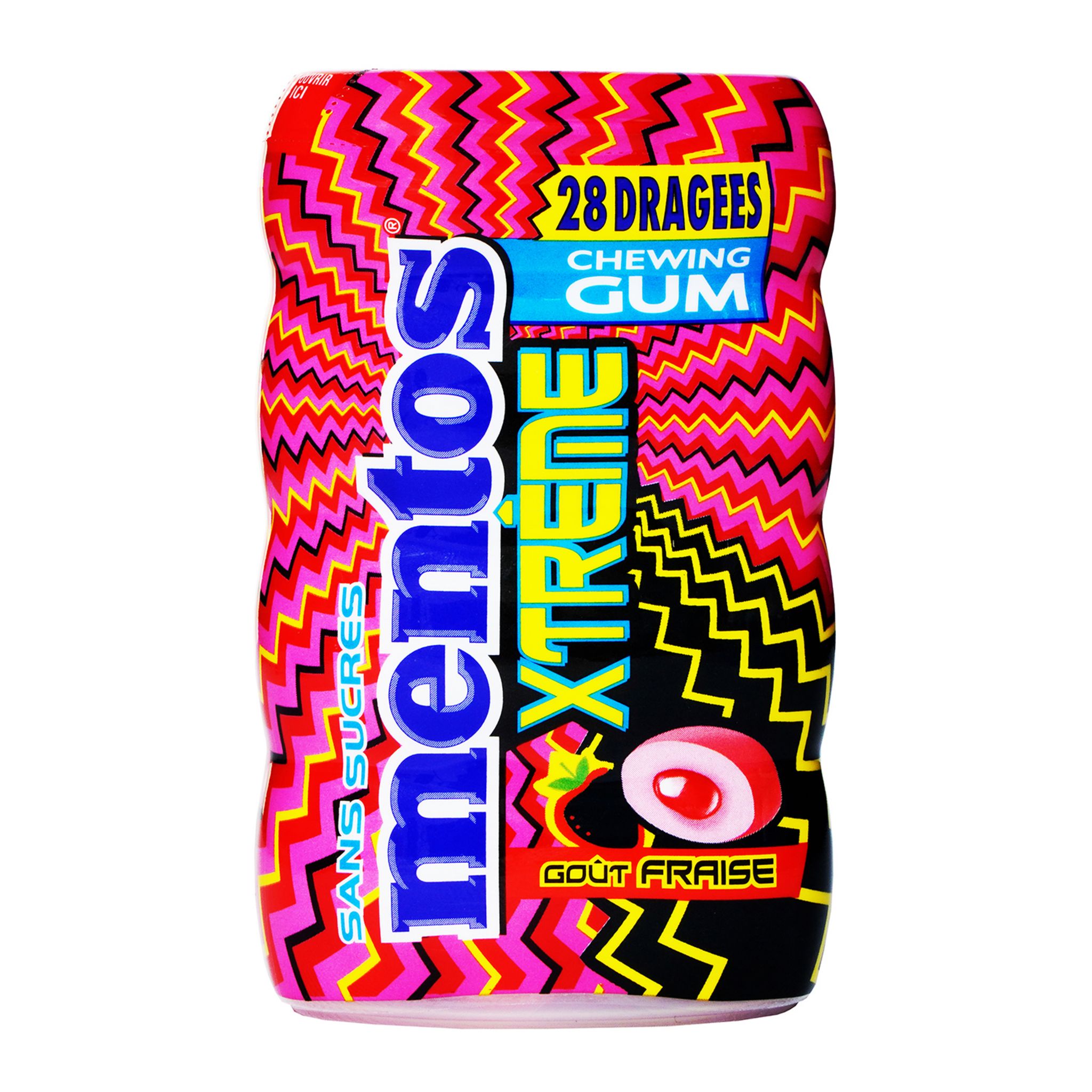 Découvrez Mentos XTREME, Une delicieuse dragées de chewing-gum sans sucres au cœur fourré a la saveur FRAISE avec un enrobage acidulé.