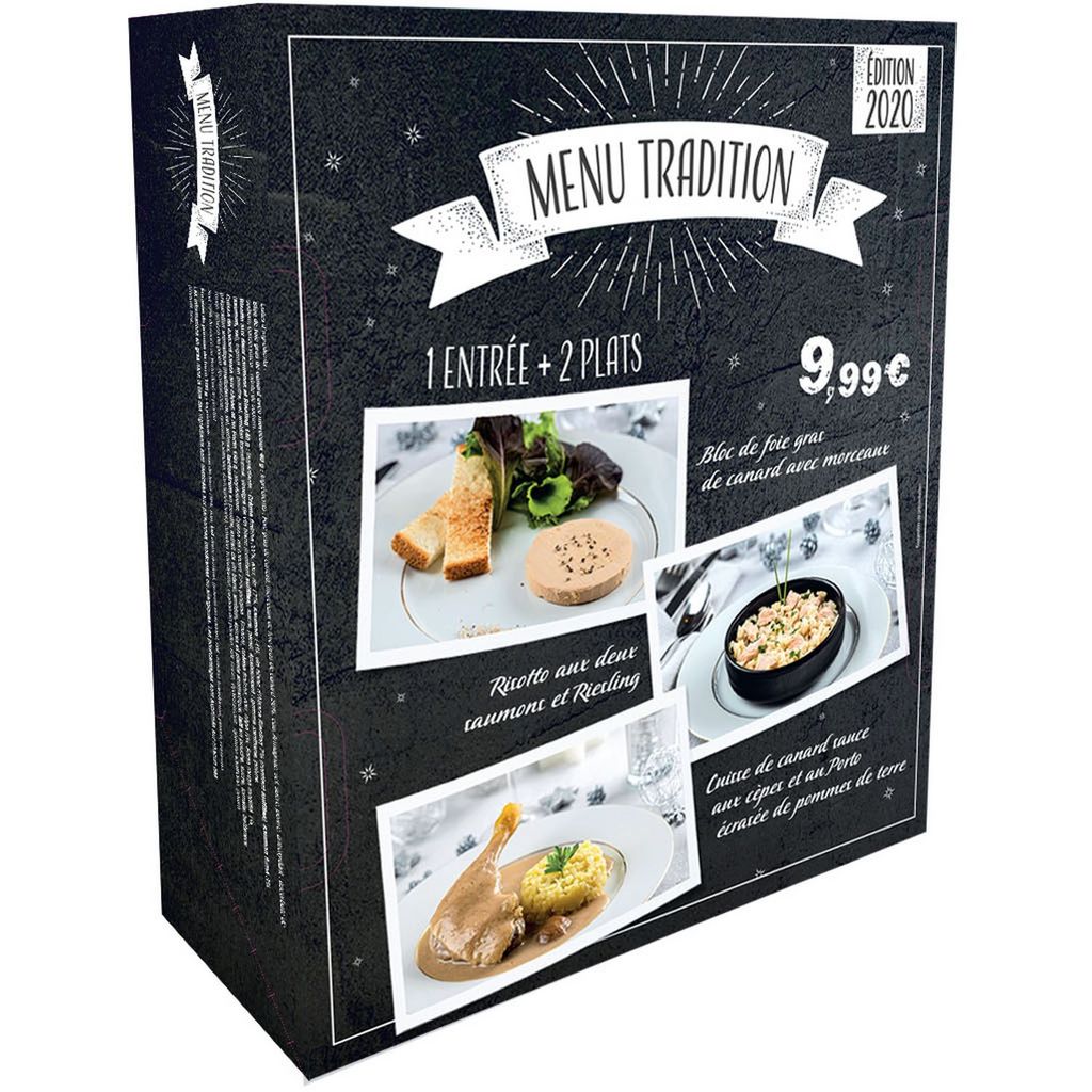 Foie gras de canard bloc Risotto au saumon et aux poireaux Cuisse de canard jus corsé Ecrasée de pommes de terre a l'échalote
