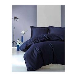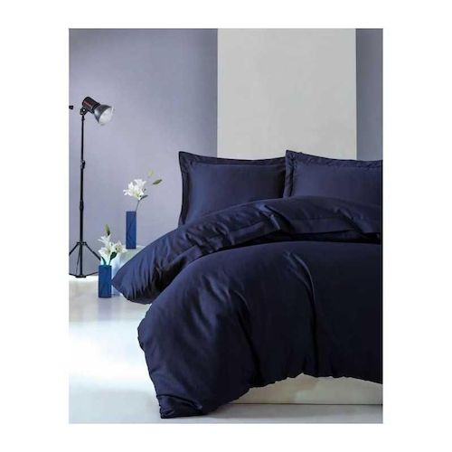 Set housse de couette 240x220cm et 2 taies d'oreiller Lovina uni Satin de Coton Bleu foncé
