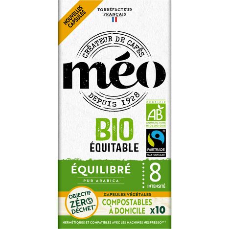 CAFE MOULU EN CAPSULES EQUILIBRE Café pur arabica Biologique 100% compostable. C'est la torréfaction la plus courante en France et en Italie du Nord. Le temps de cuisson est optimisé pour révéler toutes les saveurs du café avec un juste équilibre entre amertume et acidité. Capsules compatibles avec les machines Nespresso®*: Citiz®*, Essenza®*, Pixie®*, Lattissima®*, Maestria®*, U®*, Umilk®*, Inissia®* Nespresso®*. * Marque appartenant à un tiers n'ayant aucun lien avec Cafés Méo