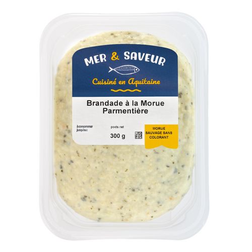 Eau , morue ( poisson : Gadus morhua) 20%, églefin ( poisson : Melanogrammus aeglefinus) 10%, flocons de pomme de terre (Pommes de terre deshydratées, émulsifiant (mono et diglycérides d'acides gras), poudre de curcuma), poudre de LAIT, oignons frits (oignons, huile de tournesol), crème (LAIT), ail, persil.