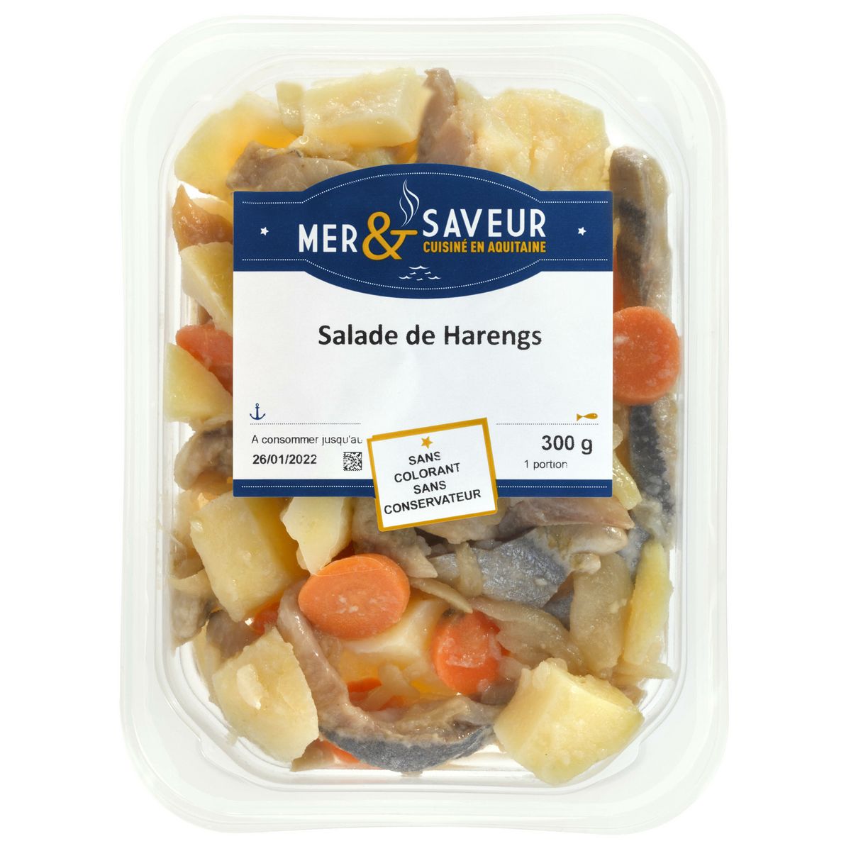 salade de harengs fumés (22 %), pommes de terre fraîches, carottes et oignons marinés au vin blanc accompagnés d'une vinaigrette.