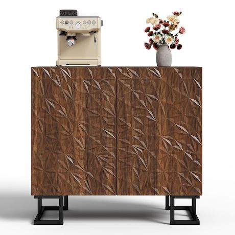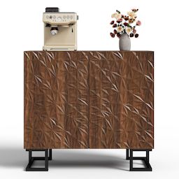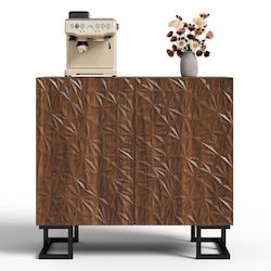 La nature rencontre l'art – avec un relief végétal unique : les façades de l'armoire sont ornées d'un motif végétal organique et asymétrique, inspiré de la poésie de la nature. La finition chaleureuse en noyer foncé confère à la pièce une touche élégante et chaleureuse.