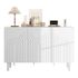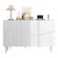 Design des portes : Les trois portes arborent des motifs imprimés uniques (et non des fleurs), ajoutant une touche artistique à la structure blanche épurée du meuble, transformant ce buffet en un objet décoratif plutôt qu'un simple meuble de rangement.