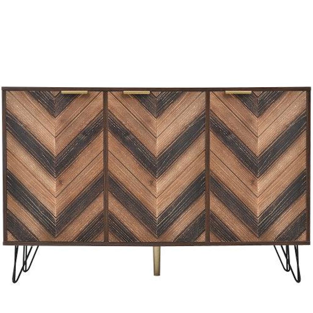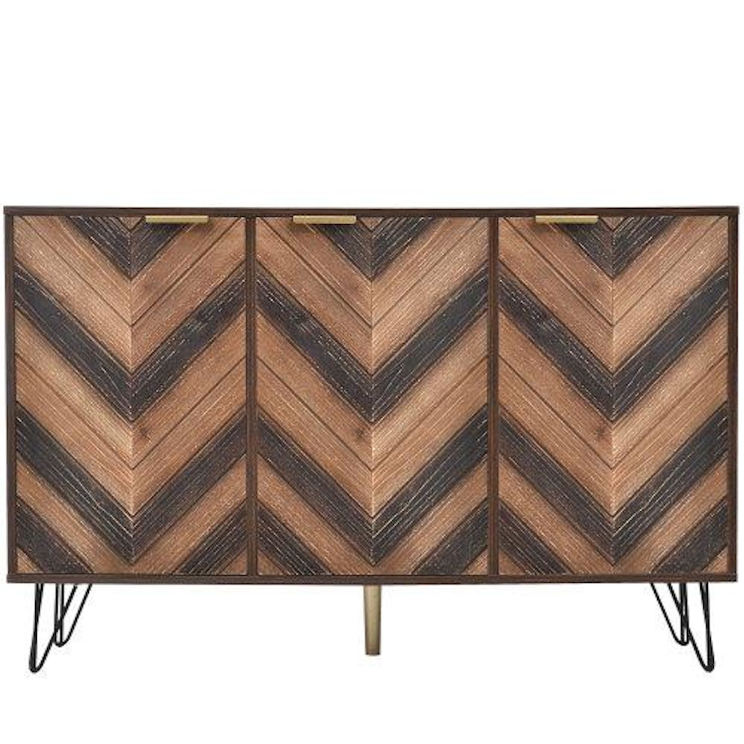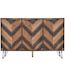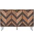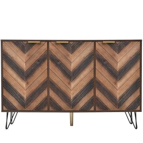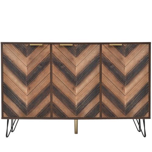 Le buffet dispose de trois portes derrière chacune desquelles se trouve un compartiment spacieux avec une plaque d'insertion. Cela vous permet de personnaliser l'espace intérieur afin d'organiser vos objets de manière optimale. Les portes sont dotées de poignées dorées et décorées de veines de bois naturelles, ce qui donne au buffet un look élégant et moderne.