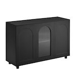 Élégance intemporelle : Ce buffet noir allie des lignes épurées et modernes à une sophistication discrète. Les façades de portes légèrement incurvées, associées à la porte centrale dotée d'un panneau en verre texturé, dégagent une élégance à la fois discrète et saisissante. Ce design crée une atmosphère harmonieuse et accueillante qui s'intègre parfaitement aux intérieurs minimalistes comme aux plus sophistiqués.
