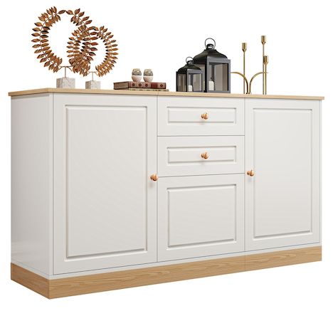 Multiples options de rangement : Un meuble à double porte, deux tiroirs et un compartiment central fermé offre un rangement organisé pour la vaisselle, les accessoires et les petits objets. L'association de compartiments fermés et de tiroirs assure un équilibre optimal entre espace de rangement et accessibilité.