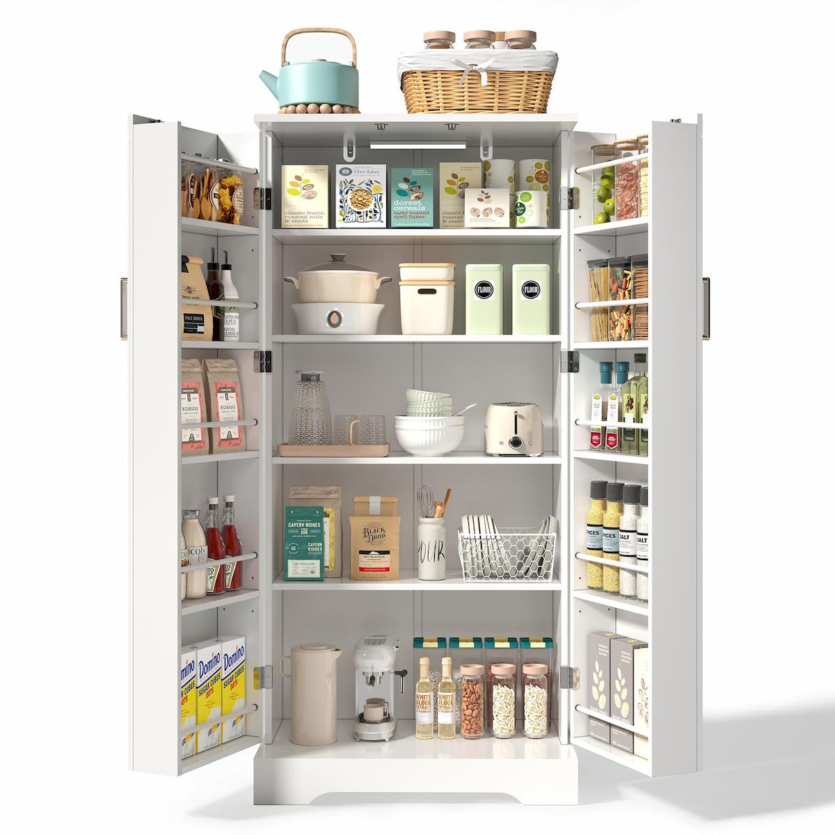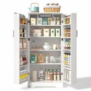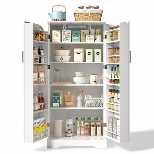 Rangement flexible : l'intérieur dispose de 5 niveaux, dont un réglable en hauteur pour accueillir des objets de différentes hauteurs. Les deux portes disposent chacune de 5 étagères supplémentaires, dont deux réglables en hauteur, idéales pour ranger pots à épices, bouteilles d'huile ou petits ustensiles de cuisine.