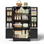 Rangement spacieux et divisé : La partie supérieure comprend deux étagères réglables et un balconnet de porte réglable, réglables en hauteur ou amovibles selon les besoins, idéal pour un rangement flexible des aliments, de la vaisselle, des épices et autres petits objets. La partie inférieure offre un grand espace de rangement, idéal pour des appareils électroménagers comme un micro-ondes ou une cafetière.