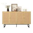 Buffet en panneaux de particules avec 4 portes en rotin,140x39,5x80cm,bois clair