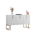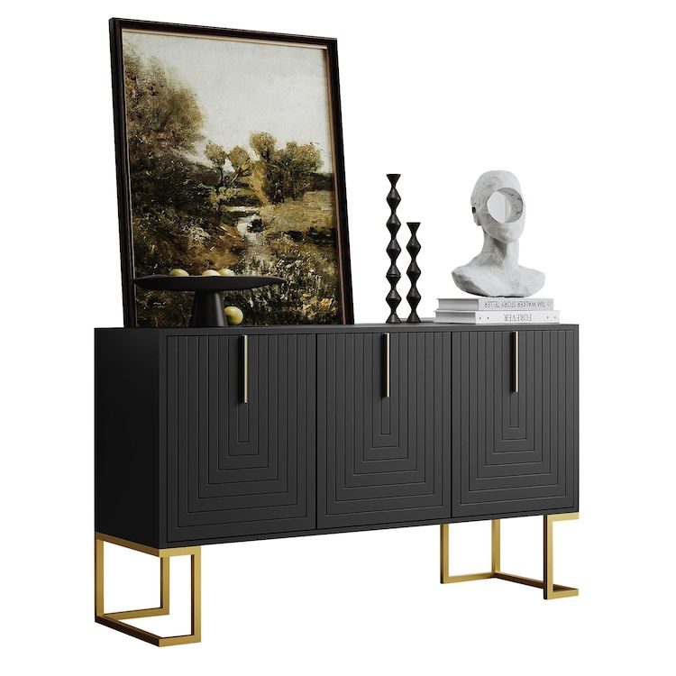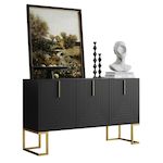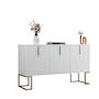 Matériau de haute qualité : les fines poignées dorées ajoutent de la modernité et de la sophistication au meuble. La base métallique en forme de L offre un support solide. Nous insistons sur le choix de matériaux de haute qualité et sur la combinaison de Panneau composite de fibres de bois à densité et de panneaux de particules afin que nos produits aient non seulement un aspect élégant mais également des propriétés durables. Capacité de charge du plateau : 75 KG.