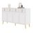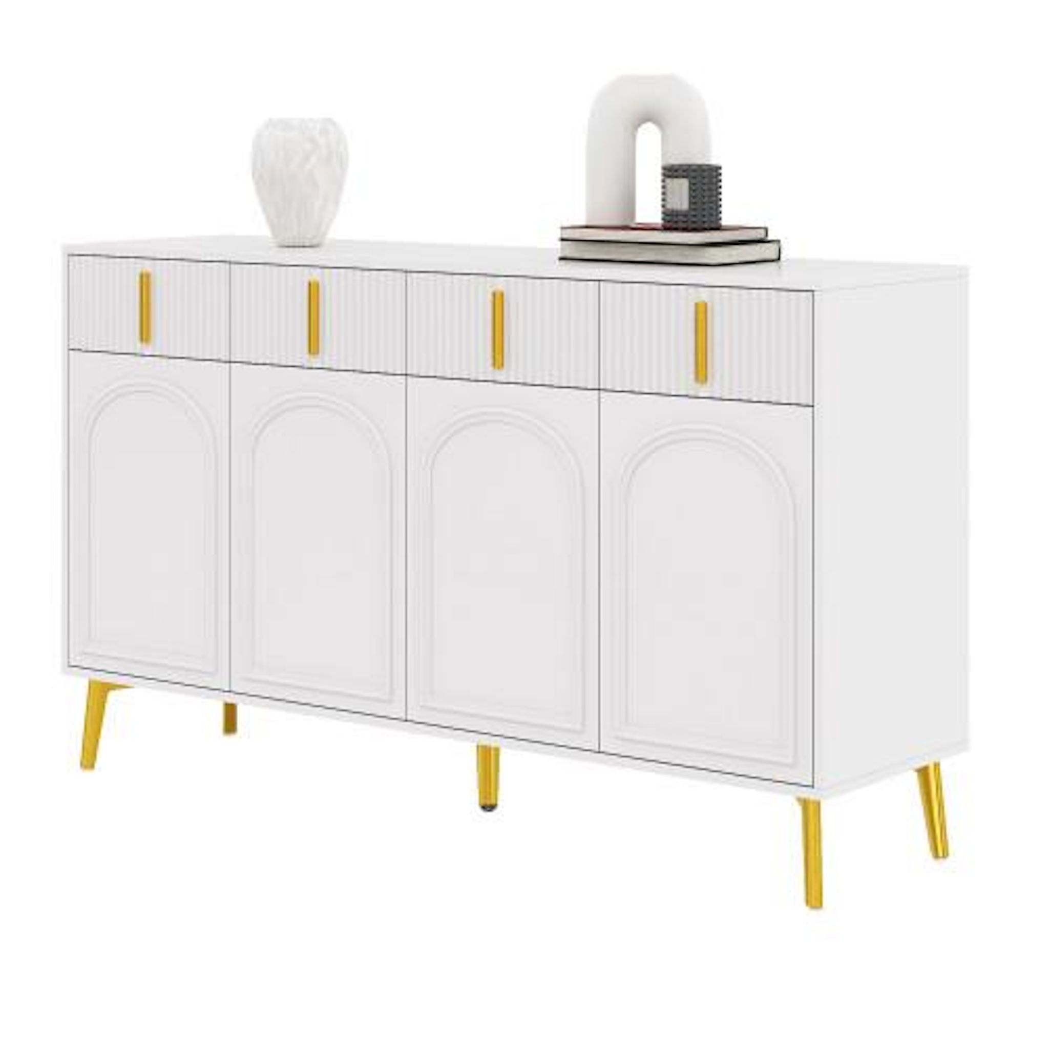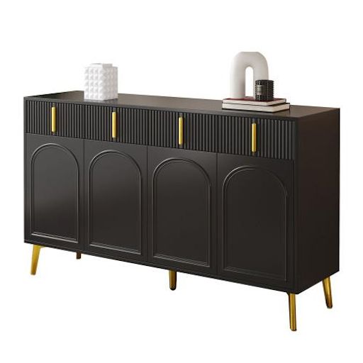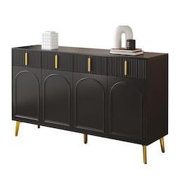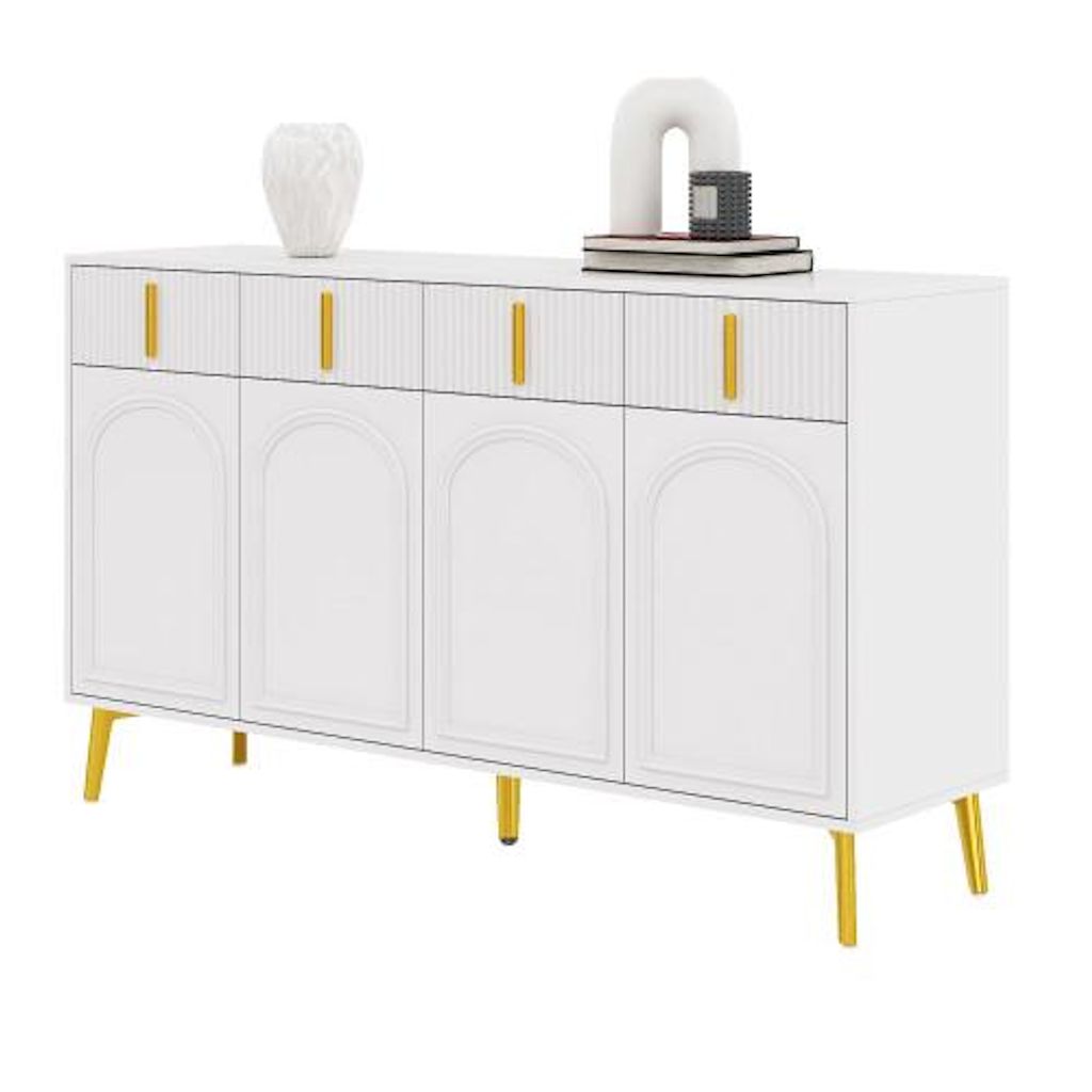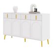Buffet avec poignées et pieds dorés, 4 portes, 4 tiroirs, avec stratifié amovible, adapté au salon et à la salle à manger. Il est fabriqué en Panneau composite de fibres de bois à densité robuste et recouvert de mélamine de haute qualité. Il allie durabilité et esthétique élégante et moderne. La surface lisse le rend non seulement élégant