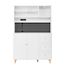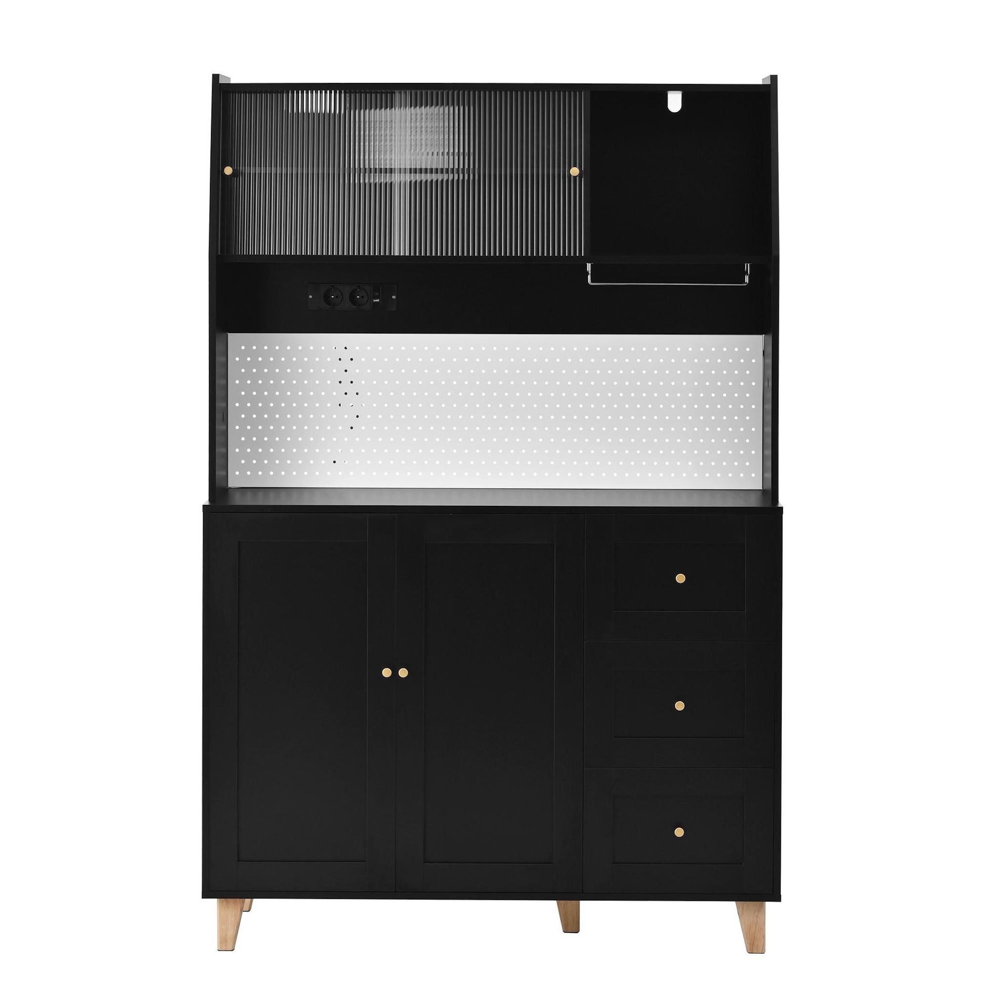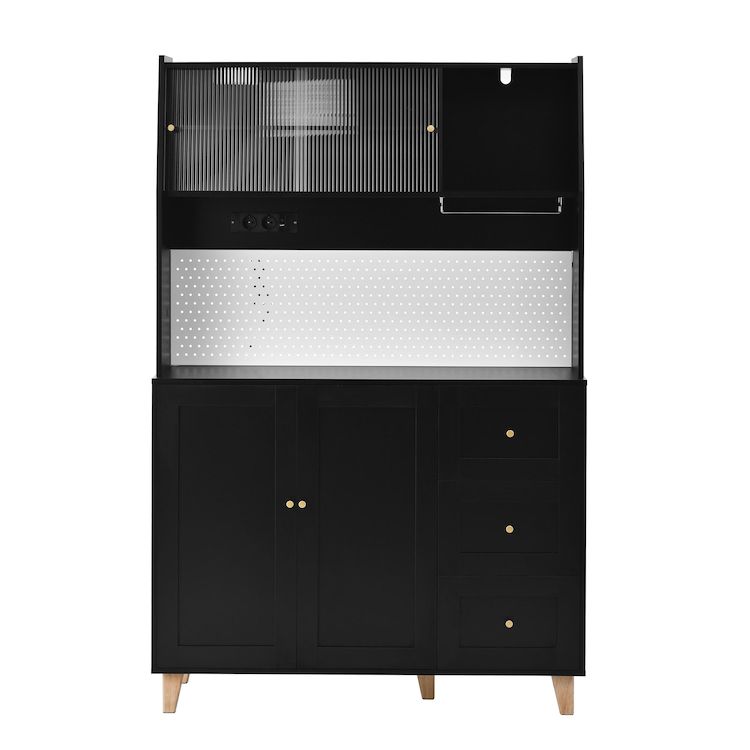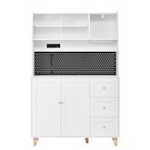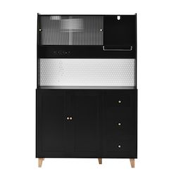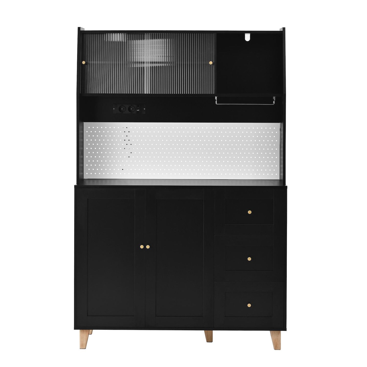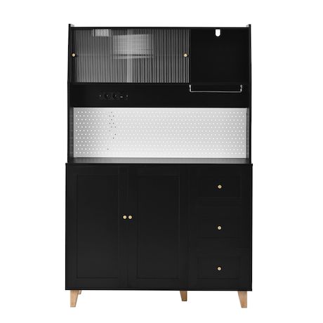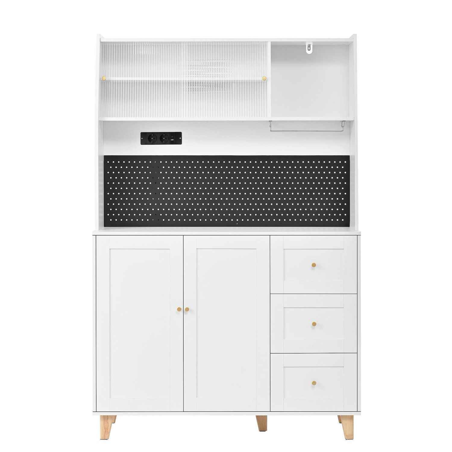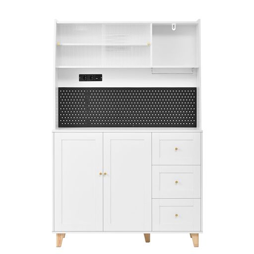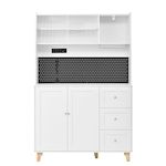 Conception ingénieuse : le panneau perforé astucieusement conçu de la haute armoire offre un espace de rangement facilement accessible pour les ustensiles de cuisine tels que ciseaux, ouvre-bouteilles ou tasses à mesurer – fini les recherches ! Une station de charge intégrée comprend deux prises pour petits appareils électroménagers, ainsi qu'un port USB et un port Type-C pour recharger vos appareils intelligents. De quoi optimiser l'organisation et la praticité de votre cuisine ou de votre salon.