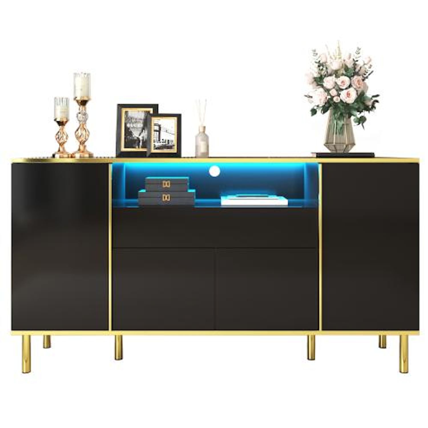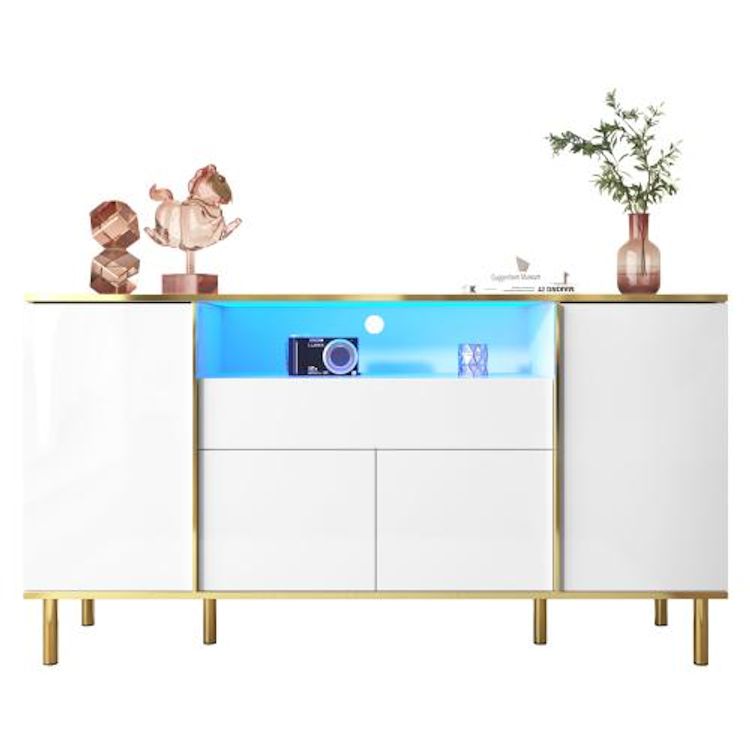 Design élégant : notre grand buffet redéfinit l'élégance. Avec une finition brillante et des bords dorés, il ajoute une touche de glamour à n'importe quelle pièce. Les pieds dorés ornés soulignent sa grâce, tandis que la finition parfaite assure l'admiration.
