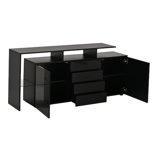 【Grand espace de rangement et matériau durable】 Ce meuble d'appoint en bois de 160 cm est fabriqué en panneaux de particules, offrant une excellente stabilité et une surface facile à nettoyer. Il comprend 2 portes, 2 compartiments de rangement ouverts, 4 tiroirs et 1 compartiment en verre pour ranger divers objets tels que vaisselle, assiettes et tasses. Le plateau supérieur peut également servir à exposer vos livres, vases et cadres photo pour décorer votre salon.