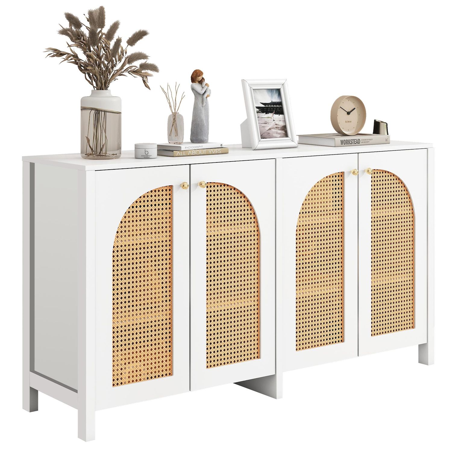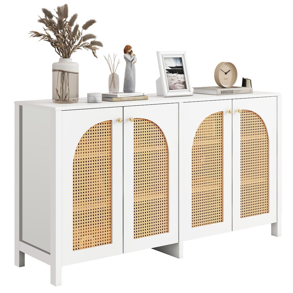 Placard polyvalent : placard à quatre portes avec portes en faux rotin de forme spéciale. Des poignées métalliques confortables et un cadre droit peuvent être placés dans votre salon, votre bureau et d'autres endroits, ce qui en fait un choix idéal pour n'importe quelle pièce de votre maison. Il y a trois couleurs au choix. Les détails de l'ensemble du meuble montrent la simplicité et la générosité du meuble, et le meuble altique peut être facilement combiné avec votre style intérieur sans être envahissant.