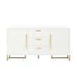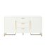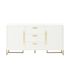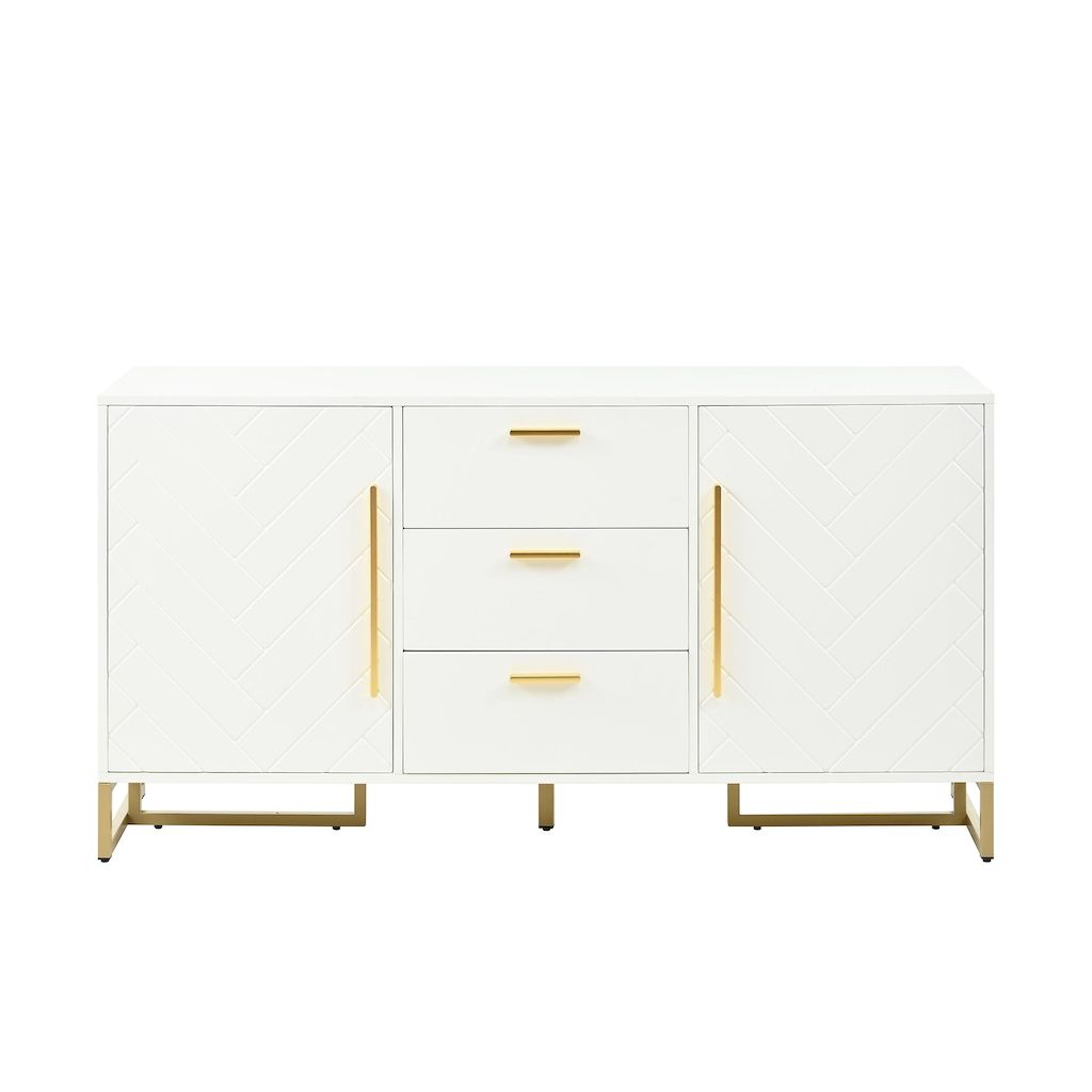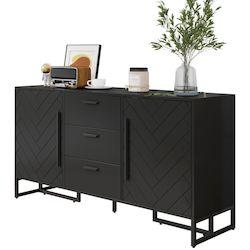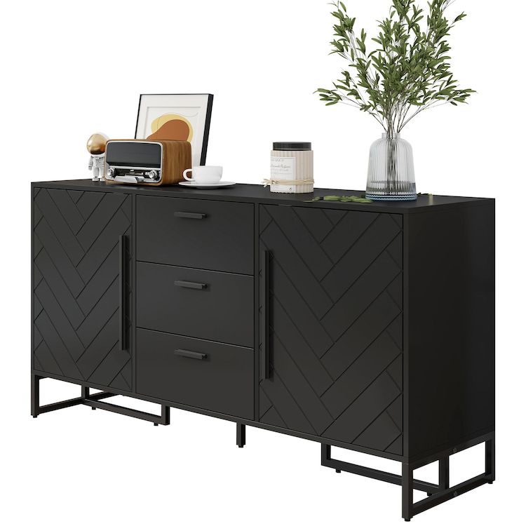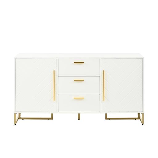 Détails soignés : Les lignes épurées et l'esthétique minimaliste du buffet sont magnifiquement mises en valeur par le motif à chevrons des portes, offrant un élément de design subtil et distinctif, tandis que les fines poignées dorées accentuent son allure minimaliste. La surface plane du buffet, pouvant supporter jusqu'à 50 kg, est idéale pour exposer vos objets décoratifs préférés.