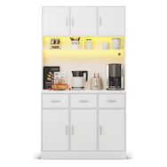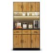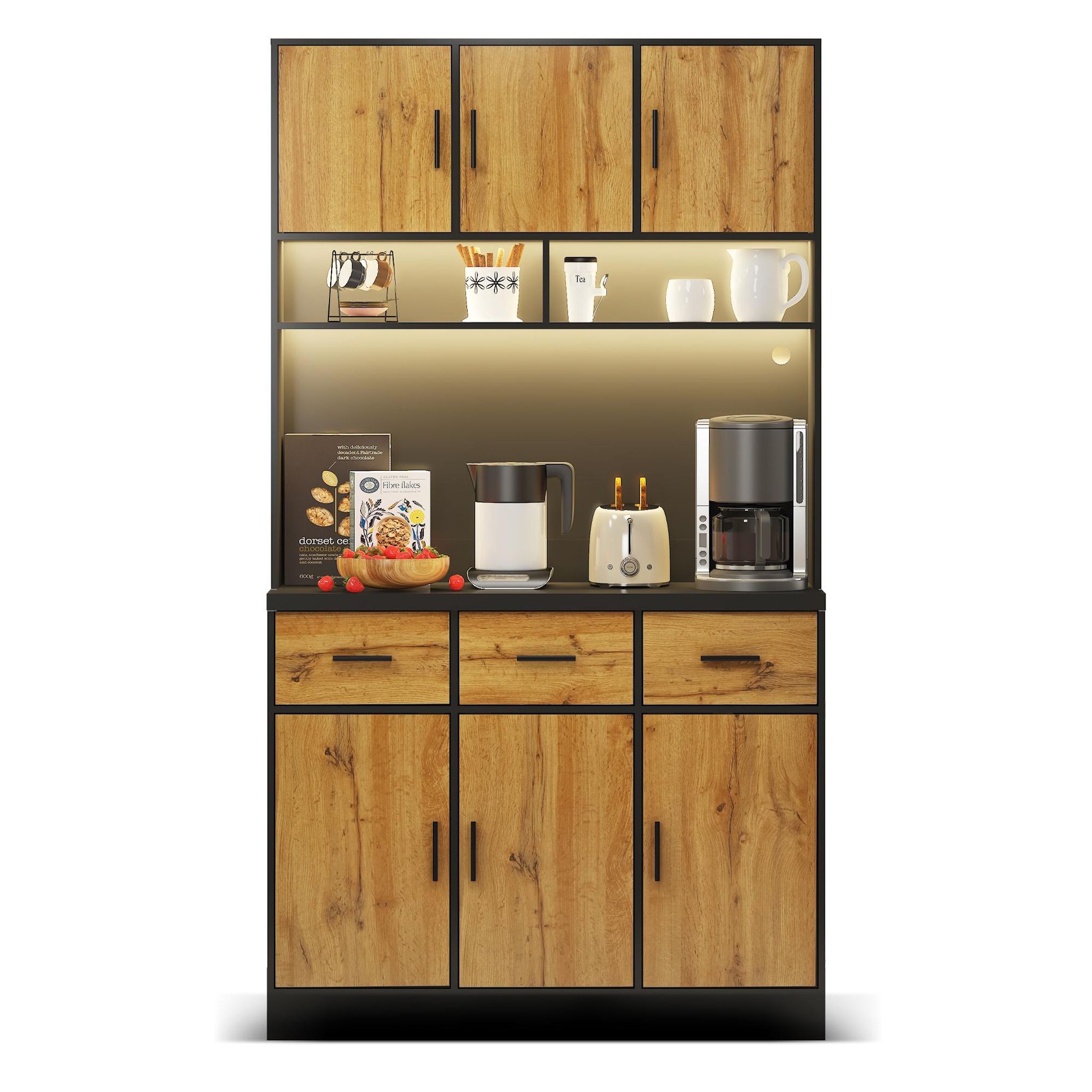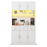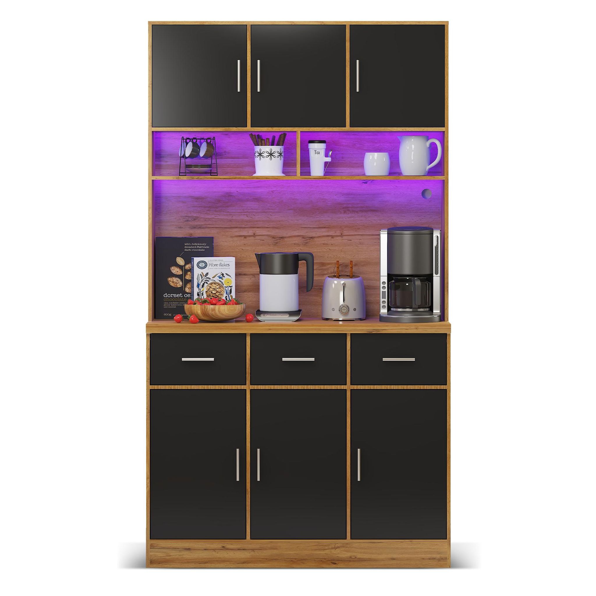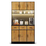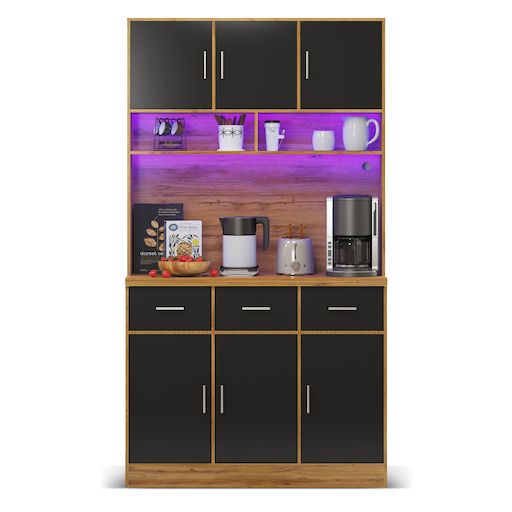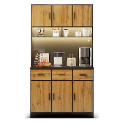 Grand espace de rangement au design bien pensé : l'armoire de 180 cm de haut est divisée en deux zones principales. Armoire inférieure (80 cm de haut) : équipée de 3 tiroirs silencieux et de 3 portes d'armoire contenant des étagères réglables - parfaite pour un rangement ordonné Zone supérieure : Espace généreux pour micro-ondes, machine à café ou autres appareils, avec compartiments ouverts et fermés pour une utilisation flexible.