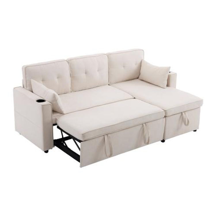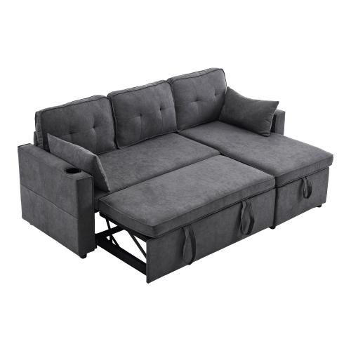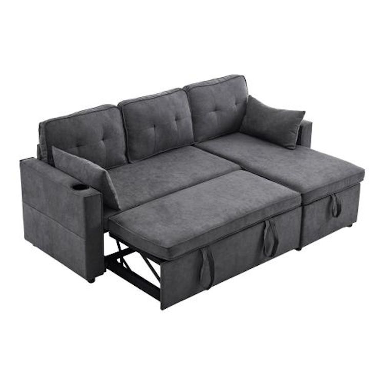 Se déplie comme un canapé-lit et offre plus d'espace et de confort. Les poches latérales des deux côtés de l'accoudoir sont idéales pour placer des télécommandes, des téléphones portables et des magazines, et les porte-gobelets des deux côtés sont adaptés pour placer des bouteilles d'eau. De plus, le canapé est équipé de deux coussins pour plus de confort.