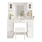 Fonctionnalités intelligentes : La coiffeuse dispose d'une multiprise intégrée avec 2 prises standard, 1 port USB et 1 port Type-C. Un support pour sèche-cheveux est fixé sur le côté du meuble pour faciliter l'utilisation des fers à friser, des appareils de beauté et des sèche-cheveux.
