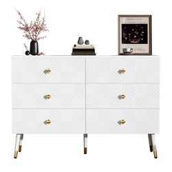 DESIGN MODERNE – Élégante commode blanche avec motifs géométriques et poignées en forme de losange pour une ambiance élégante.ESPACE DE RANGEMENT GÉNÉREUX – Six tiroirs spacieux offrent de l'espace pour les vêtements, les accessoires et plus encore.PIEDS EN MÉTAL ROBUSTES – Pieds blancs et dorés (20