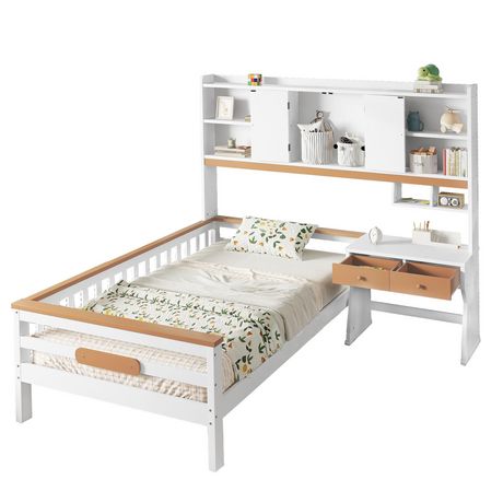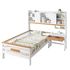 Design multifonctionnel : Ce lit en L est doté d'une table avec deux tiroirs intégrés, d'une armoire à deux portes et de deux compartiments ouverts, offrant un espace de rangement supplémentaire et un espace de travail pratique.