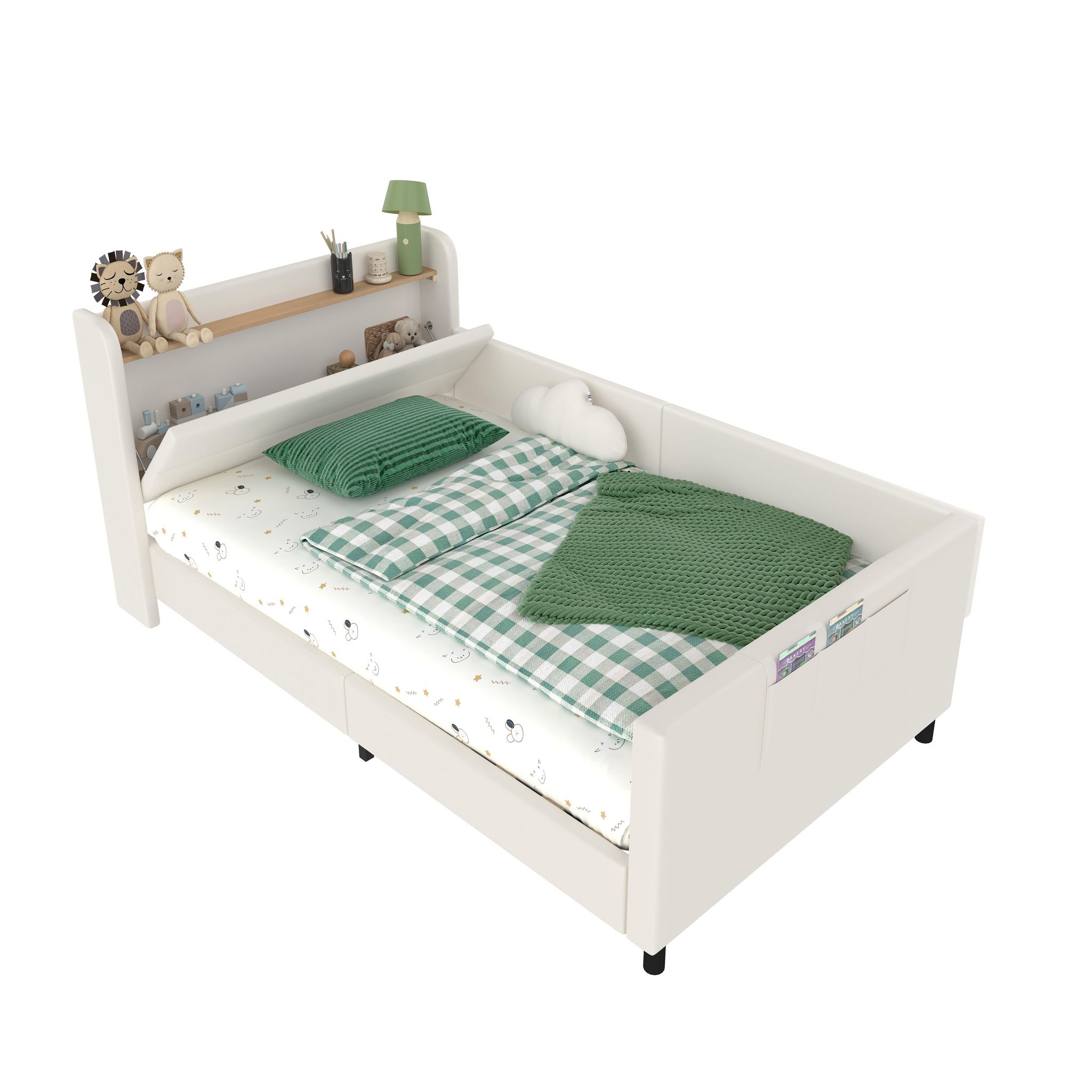 Grand espace de rangement : Ce modèle de table de chevet comprend une armoire de rangement avec porte rabattable et des étagères permettant de ranger réveils, jouets, livres d'images et autres objets du quotidien. Trois petites poches sont situées à l'arrière du lit pour un espace de rangement supplémentaire.