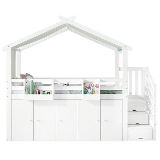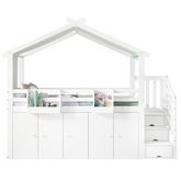 Vaste espace de rangement : Une penderie et deux placards de rangement sont situés sous le lit, ainsi qu'un escalier latéral avec trois placards, offrant un espace de rangement flexible pour vêtements, livres, jouets ou autres effets personnels.