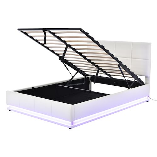 Lit moderne avec éclairage LED - Orné d'un élégant revêtement en similicuir, ce lit est doté d'un magnifique éclairage LED périphérique, contrôlé par une télécommande à 24 boutons offrant 4 modes de changement de couleur automatiques et 16 options de couleurs personnalisables.