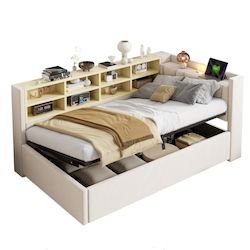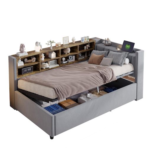 Rangement hydraulique dissimulé - Ce lit rembourré avec rangement hydraulique offre un espace de rangement dissimulé et spacieux pour vos livres, jouets, vêtements et autres objets.
