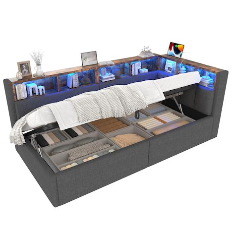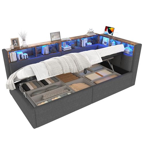 Organisation astucieuse : Des compartiments de rangement judicieusement placés dans la tête de lit et sur les côtés permettent de ranger les petits objets et de garder votre chambre bien rangée.