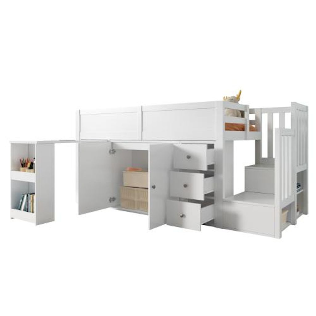 Conception pratique : Équipé d'armoires et de tiroirs, son grand volume offre de l'espace pour les objets volumineux tels que les vêtements et les jouets des enfants. Il dispose également d'une armoire escalier et d'une étagère sur le côté du bureau, permettant aux enfants de ranger les petits objets du quotidien et de répondre à divers besoins de rangement.