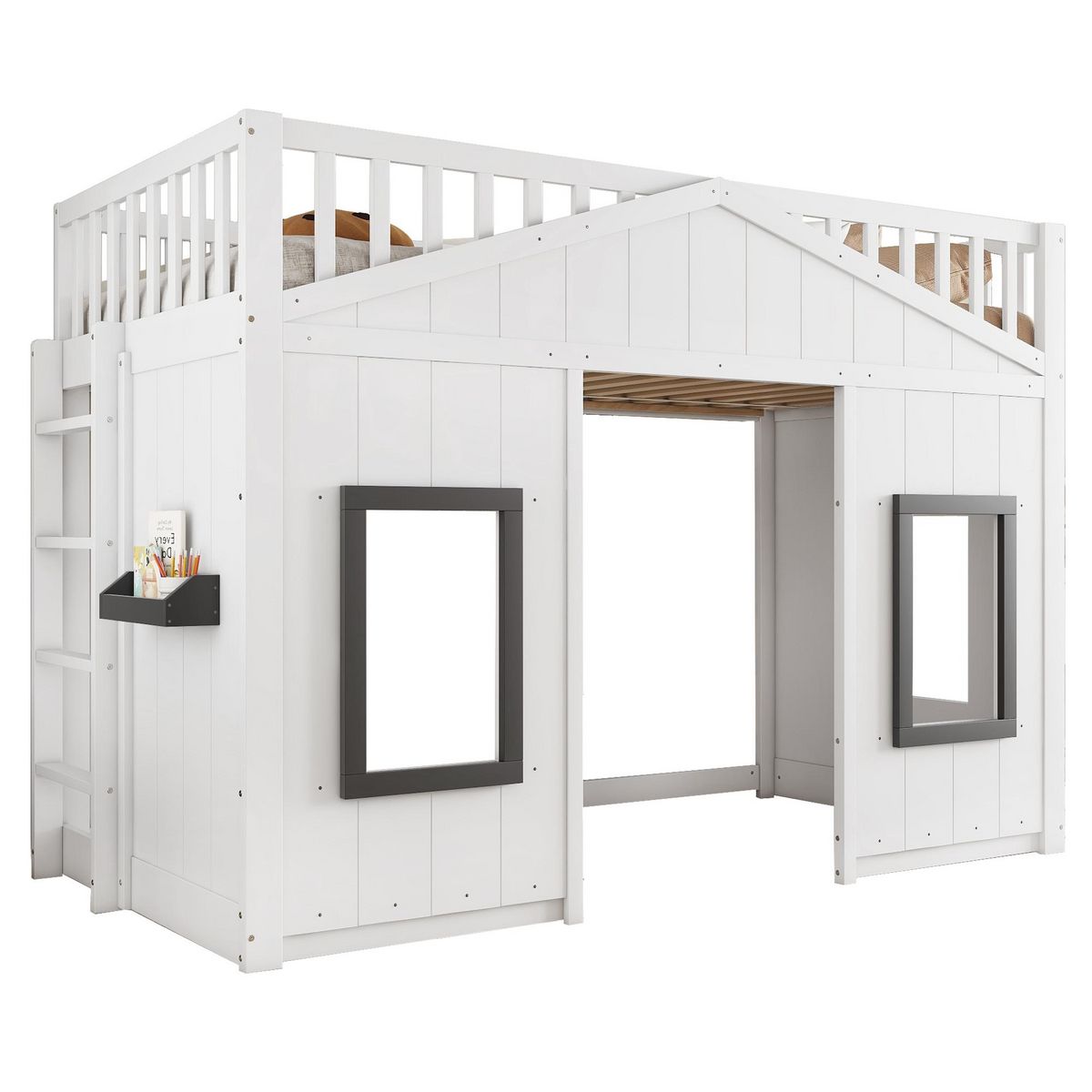 Un design ludique : Le lit superposé est doté de panneaux blancs à rayures verticales et de deux belles fenêtres grises dans la couchette inférieure. Son design global assure à la fois rangement et intimité, ainsi qu'une circulation d'air optimale pour un confort maximal.